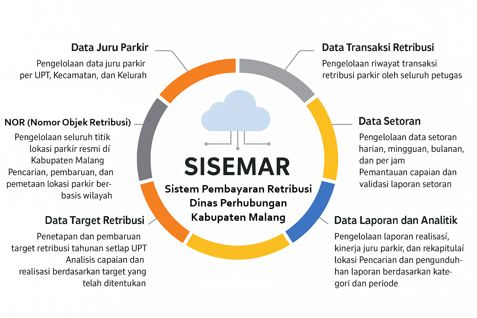 Sistem Informasi Retribusi Parkir Kabupaten Malang (SISEMAR), yang dikembangkan oleh Dinas Perhubungan Kabupaten Malang sebagai bentuk inovasi dalam pengelolaan retribusi parkir. Sistem ini dirancang untuk memudahkan proses pendataan juru parkir, pencatatan transaksi, pengelolaan setoran, pemantauan target, serta penyusunan laporan retribusi secara cepat, akurat, dan transparan.